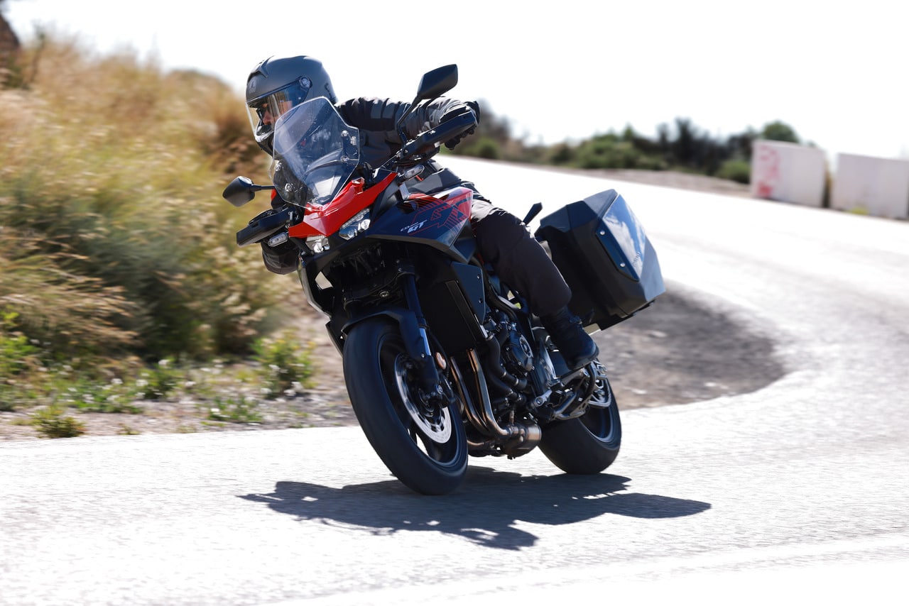 In puro stile Honda, la GT parte da una base tecnica sana e conosciuta, con telaio e motore derivati dalla Honda CB1000Hornet, che a sua volta aveva già ereditato il motore dalla Fireblade, da cui questa GT riprende anche i fari anteriori. Questa base, ha rappresentato un nuovo punto di partenza da cui i tecnici hanno progettato la nuova carenatura anteriore utilizzando il CFD (software che simula il comportamento dell’aria) per permetterle di attraversare il flusso senza che questo crei turbolenze aerodinamiche, ed hanno integrato il tutto con una ciclistica ed un comparto elettronico completamente riprogettati, dando vita ad una piccola magia. Più compatta rispetto a molte competitor, nei fatti questa GT sfrutta una tecnologia in grado di evitare turbolenze laterali su casco e spalle del pilota. È tesa e slanciata, e lascia il telaio visibile per esprimere leggerezza. Il parabrezza manuale è regolabile su 5 posizioni con 81 mm di escursione, se mantenuto in basso lascia passare un po’ d’aria (utile quando fa caldo), mentre posizionato in alto pulisce il flusso ed è ideale nei trasferimenti lunghi; volendo c’è in opzione un parabrezza alto unito ai deflettori laterali, utile ai viaggiatori di lungo corso. Questi, realizzati in Durabio, (bioplastica realizzata da biomassa di mais non commestibile), come le scocche sella in PP riciclato, avvalorano l’impegno di Honda nel progetto Triple Action to Zero, ovvero la strategia ambientale globale che prevede di raggiungere la neutralità carbonica entro il 2050. È un “di più” di sostanza, una attenzione alle esigenze del pianeta: giù il cappello. La sella a 825 mm da terra è un buon compromesso che soddisfa la maggior parte dei piloti, e la triangolazione sella, manubrio, pedane, modificata rispetto alla Hornet regala una posizione eretta e naturale. Imbottitura maggiorata (pilota +15 mm, passeggero +39,5 mm rispetto alla sorella Hornet), manubrio ottimizzato, paramani e manopole riscaldabili, cavalletto centrale utile per mantenere catena pulita e regolata senza doversi inventare acrobazie. Le valigie laterali (37 L sx, 28 L dx) offrono 65 litri di carico disponibile e sono perfettamente integrate nella silhouette della moto, lasciando intravedere la coda sportiva. Strumentazione TFT 5″ con tecnologia proprietaria di Honda ad incollaggio ottico, che regala riflessi ridotti e neri più intensi, Honda RoadSync per navigazione turn-by-turn, chiamate e musica (iOS/Android), comoda presa USB-C sotto la strumentazione. Smart Key, indicatori a disattivazione automatica con lampeggio rapido in frenata d’emergenza, cruise control 50–160 km/h: insomma questa GT offre tutto ciò che può servire davvero nella vita reale, già di serie. Tutto ad un prezzo super, perché seppur non sia stato ancora annunciato, sappiamo tramite Honda che si attesterà intorno ai 14.000 euro. Considerando il piacere che ho vissuto guidando questa Honda, le specifiche tecniche le rimando ai paragrafi più in basso, perché ora la GT merita di essere raccontata per come funziona.