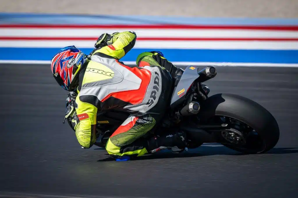 Mentre scambio opinioni con l’amico e telecronista della superbike di Sky Edoardo Vercellesi, intravedo la Panigale V4R di Dario Marchetti: quale occasione migliore per salutarlo! Mi avvicino e ne approfitto per domandare se ha tempo per qualche giro assieme, conscio che una fila di clienti erano in attesa di entrare con lui. Con il suo modo da vero gentlemen, mi guarda e mi fa “preparati per il prossimo turno che prima facciamo un mini briefing e poi entriamo”. Incredibile: un one-to-one con Dario Marchetti! Corro al box Ducati dove mi assegnano la Panigale V2 e attendo il briefing. Mi spiega velocemente la pista e dove mettere le ruote e poi mi dice: “vai e aspettami che vengo a prenderti”. Due sole parole: emozione unica. Dario arriva sul suo bombardone, si mette davanti a me e inizia a farmi strada. Mi fa vedere come si raccorda il Rio e poi come si percorre la Quercia, entrando alla curva del Tramonto con una classe che solo lui ha. Al curvone quasi lo perdo, per poi trovarlo che mi aspetta al Carro. Mi riavvicino e lui ci da giù ancora di gas, fa la Misano con una linea pulita e siamo ancora sul rettilineo. La Panigale V2 non ha i cavalli sufficienti per stargli vicino (tanto sarebbe impossibile comunque) ma, quando arrivano le curve, ripongo la massima fiducia nelle Pirelli DIABLO Superbike SC2, la slick di mescola intermedia utilizzata su asfalti abrasivi, ideale per i track days grazie alla loro capacità di mixare perfettamente doti di tenuta a quelle di durata. La Panigale V2 comunica massima fiducia dalla staccata all’inserimento in curva con ancora un po’ di freno in mano a moto inclinata. Granitica in appoggio, non accenna a perdere aderenza anche quando, in uscita di cura, apro il gas in maniera decisa. Ripeto il tutto per i 20 minuti del turno con Dario e dopo aver riportato la moto al box, mi dirigo da lui che mi guarda e – col suo accento emiliano e la faccia simpatica – mi dice: “te di me non hai bisogno, hai solo bisogno di esperienza su questa pista!”. Come dargli torto… ho girato pochissime volte a Misano e i punti di staccata e le linee “giuste”, ancora le devo imparare.