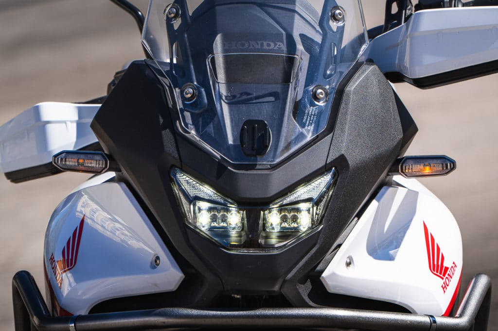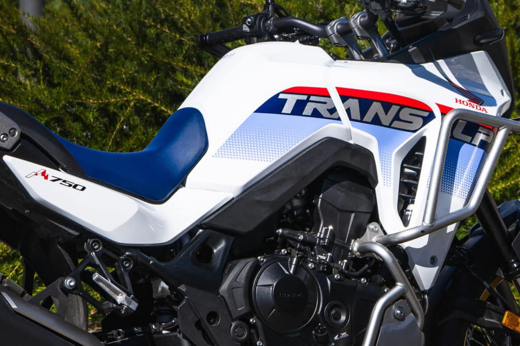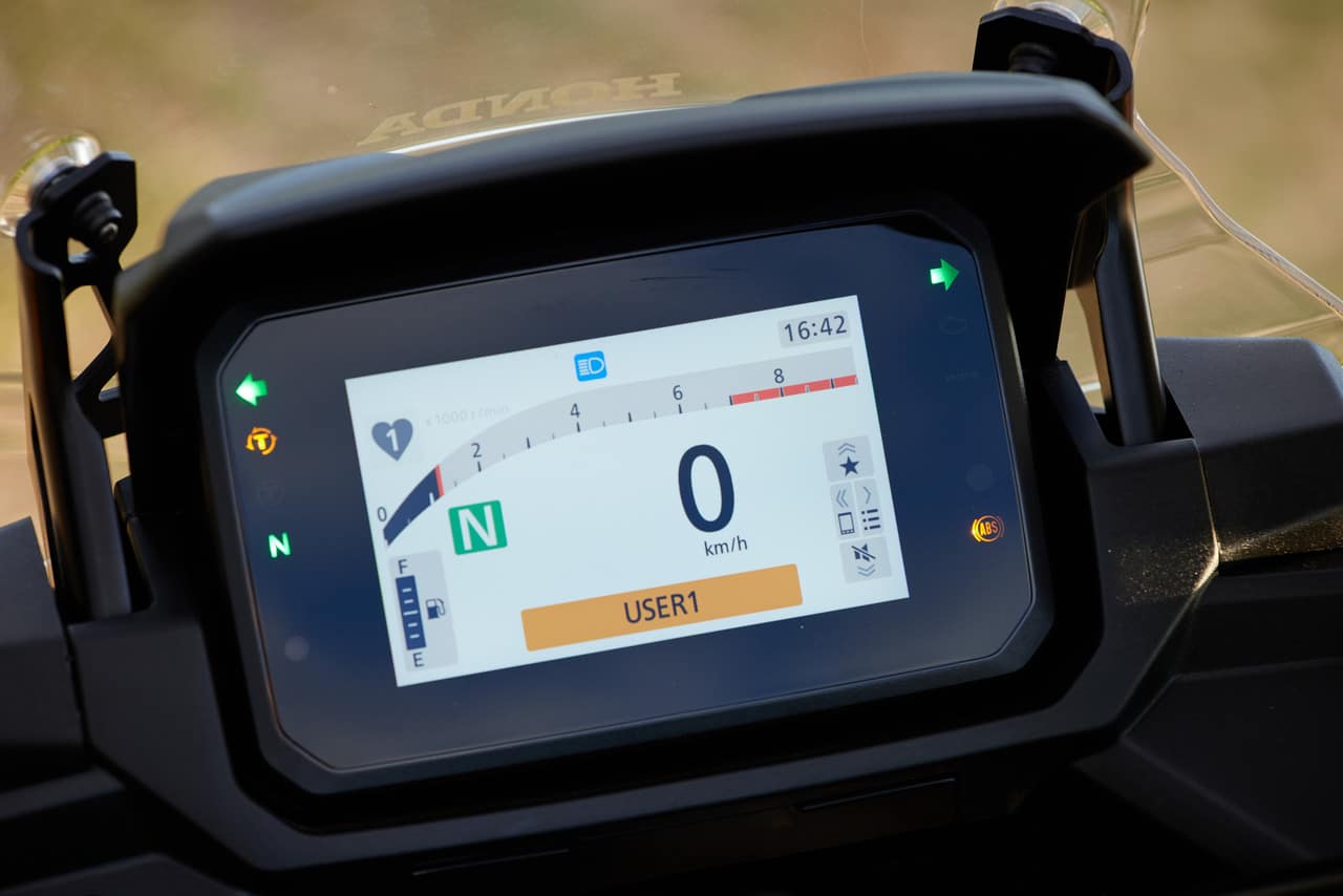 La sella da 850 mm (820 mm in caso di sella ribassata) fa sentire chi guida inserito dentro la moto e non sopra, e non va sottovalutato perchè in moltissimi casi è una scelta che regala feeling di guida e buona confidenza in ogni condizione. Il serbatoio da 16,9 litri e i consumi reali garantiscono intervalli molto lunghi tra una sosta e l’altra e difficilmente un viaggio in sella alla Transalp si dovrà interrompere per necessità di carbutante, a patto di non tirarle continuamente il collo. Lo schermo TFT da 5 pollici è dotato di una nuova tecnologia ad incollaggio ottico, ovvero una resina che interponendosi tra display e vetro di protezione, riduce i riflessi e migliora la leggibilità dei dati. Allo stesso tempo, offre migliori gradazioni cromatiche e integra il noto sistema Honda Roadsync per connettere il proprio smartphone con la moto. Chiamate, navigazione, musica, messaggi e meteo, vengono gestite attraverso il blocchetto elettrico sinistro di nuova fattura, dove il joystick retroilluminato migliora la facilità di intervento. E’ anche presente una comoda presa USB sotto la sella passeggero per ogni evenienza.
