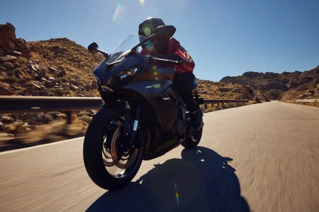 La Daytona 660 2024 è caratterizzata da linee aggressive e pulite, richiamando il classico stile del marchio. I distintivi fari doppi a LED incorporano una presa d’aria centrale, mentre le sovrastrutture minimali ne enfatizzano il carattere sportivo, terminando con una luce posteriore a LED sagomata. Tra gli altri elementi sono presenti la forcella Showa a steli rovesciati da 41mm e il monoammortizzatore Showa regolabile nel precarico al posteriore.