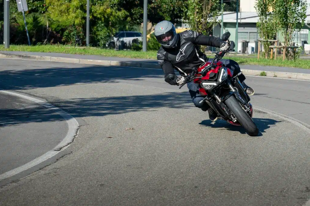 Il bello della Street Triple è che, appena sali e prendi in mano il gas, ti permette di fare ogni cosa con una semplicità disarmante: le strade si riempiono di curve e lei inizia la sua danza, forte di una discesa in piega fulminea, merito di una struttura rigida, del sostegno della forcella BPF e degli pneumatici Pirelli Diablo Supercorsa SP V3 che garantiscono un grip estremo. Non è tra le più veloci nei cambi di direzione – rimanendo ancora abbastanza “fisica” – ma è sicuramente migliorata grazie al già osannato manubrio più largo. L’anteriore incide l’asfalto e non si sposta, rimanendo stabile in percorrenza mentre il posteriore segue, obbediente, con l’Öhlins che è una garanzia. Potrebbe essere necessario intervenire sulle sospensioni per cucirla addosso al proprio stile di guida ma, in cambio, le sensazioni che saprà regalare, saranno ancora più personali. Il tre cilindri di Hinckley è esaltante, instancabile e nel misto e, grazie ai rapporti più corti, è prontissimo e veloce in uscita di curva; la schiena c’è sempre e supporta il rider fino al limitatore. Il cambio non sbaglia un colpo, sia in up che in down-shifting e, quando si chiamano a rapporto i freni – grazie alla nuova fornitura di casa Brembo – si possono ottenere decelerazioni fulminee, gestite magistralmente dalla pompa MCS che noi abbiamo tenuto sul 19, prediligendo la modulabilità rispetto intervento più secco che si avrebbe tenendola su 20 o addirittura 21. Migliorata notevolmente l’elettronica, con un ABS finalmente tarato alla perfezione, per nulla invasivo, a meno che non sia davvero necessario; idem per il controllo di trazione che gestisce anche l’anti-wheeling. Quando si spalanca il gas in modalità Track, l’anteriore tende al sollevamento ma viene gestito perfettamente, senza accusare perdite di spinta. Da segnalare un freno motore abbastanza consistente ottimo per l’utilizzo sportivo su strada, forse un pelo troppo invasivo quando si cerca la scorrevolezza in pista. La Street 765 RS piace anche nella guida di tutti i giorni, grazie alla fluidità del motore alle basse velocità, alla maneggevolezza estrema e alla sua facilità di impiego.